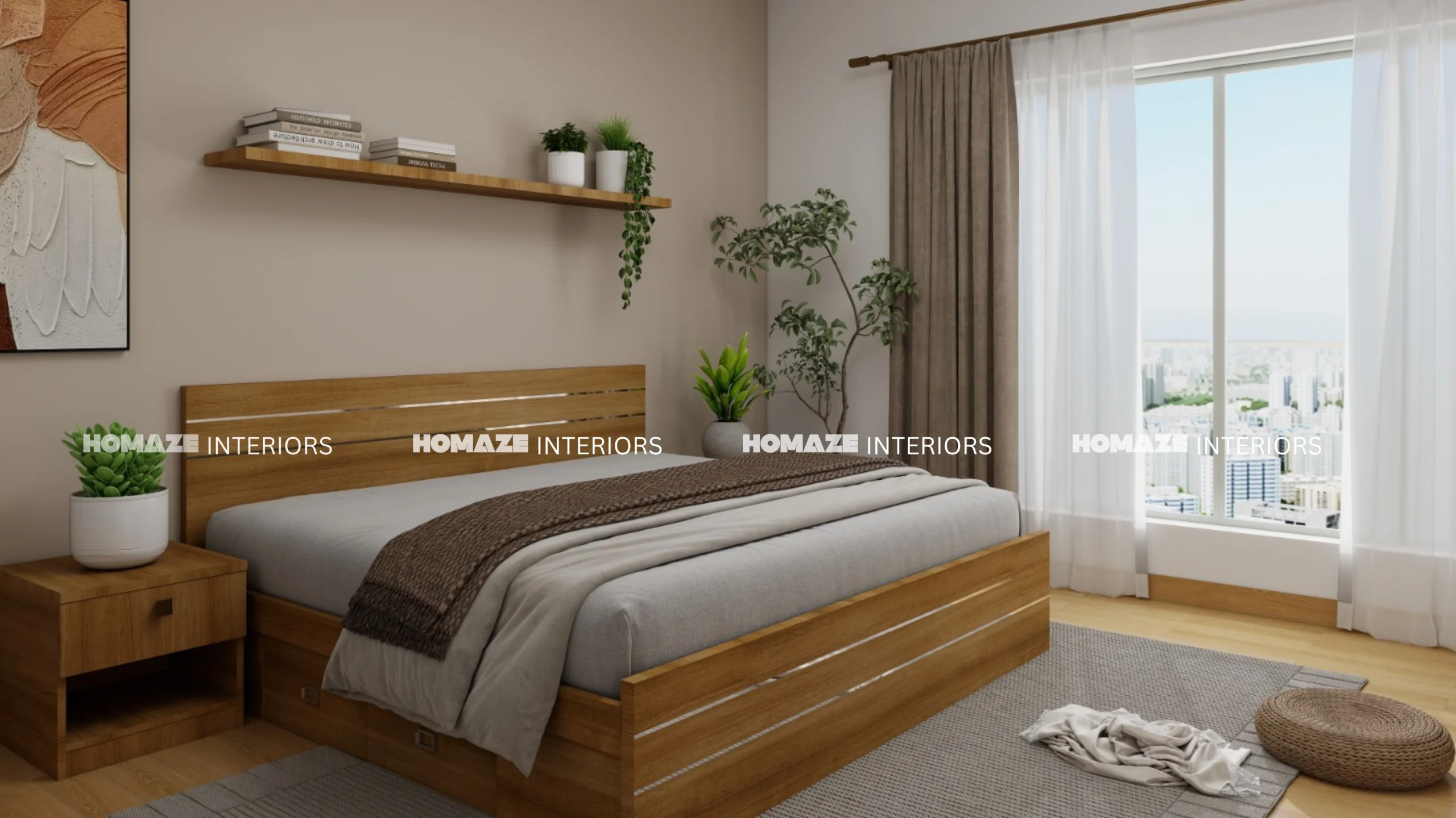 Bedroom designed for a customer in Thrissur, Kerala. tahiti teak colored king size bed cot to with two bottom storage with side table . wall design with wallpapers and niche .