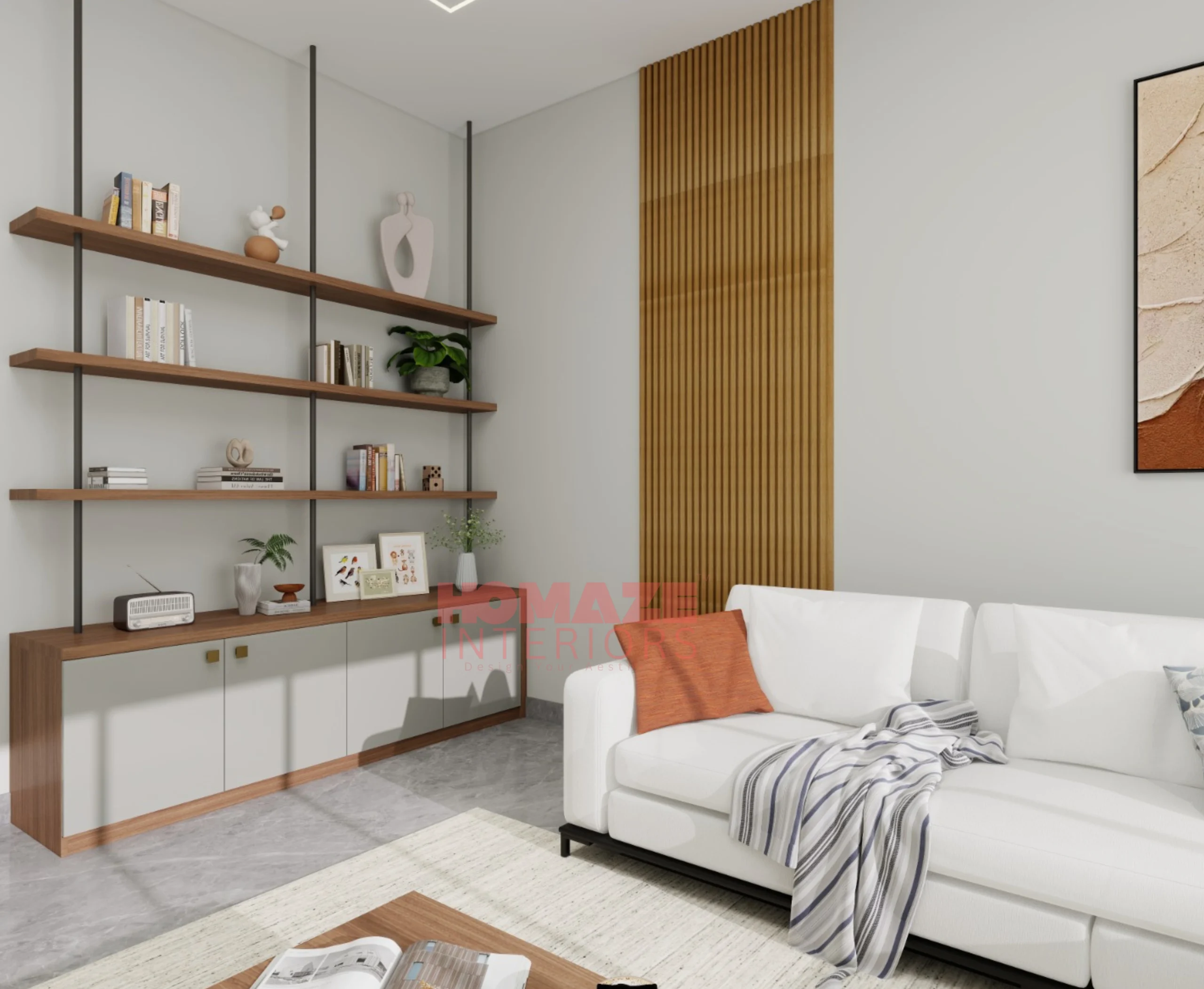 Add character and function to your living space with this custom book shelf unit by Homaze Interiors, finished in a warm Walnut Bronze and Frosty White laminate. Expertly crafted for modern Kerala homes in Trivandrum, Thrissur, and Cochin, this open-shelf design offers the perfect blend of aesthetic appeal and everyday utility.