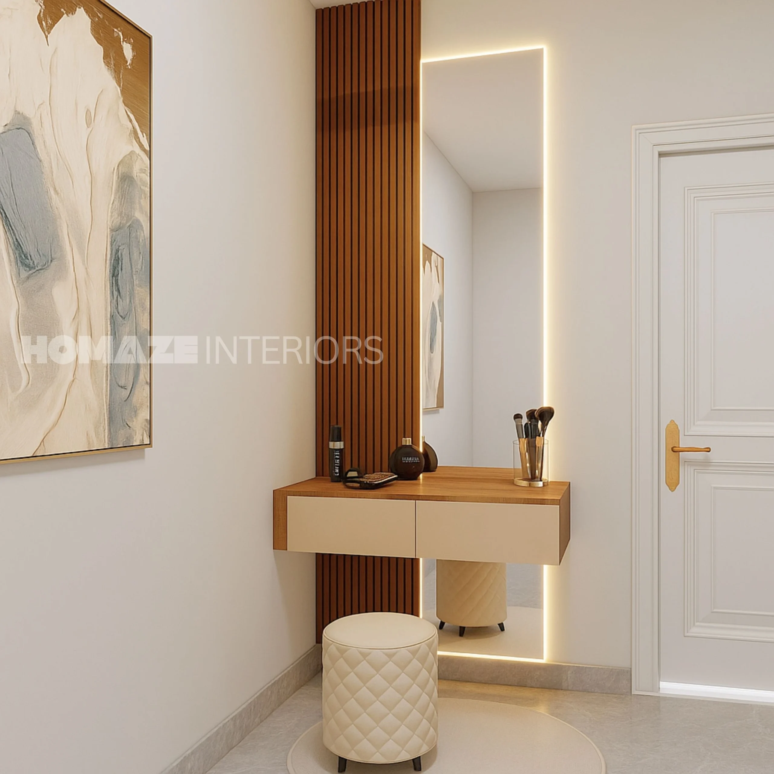 A well-organized wardrobe, storage space and dressing table for all her grooming and dressing needs.