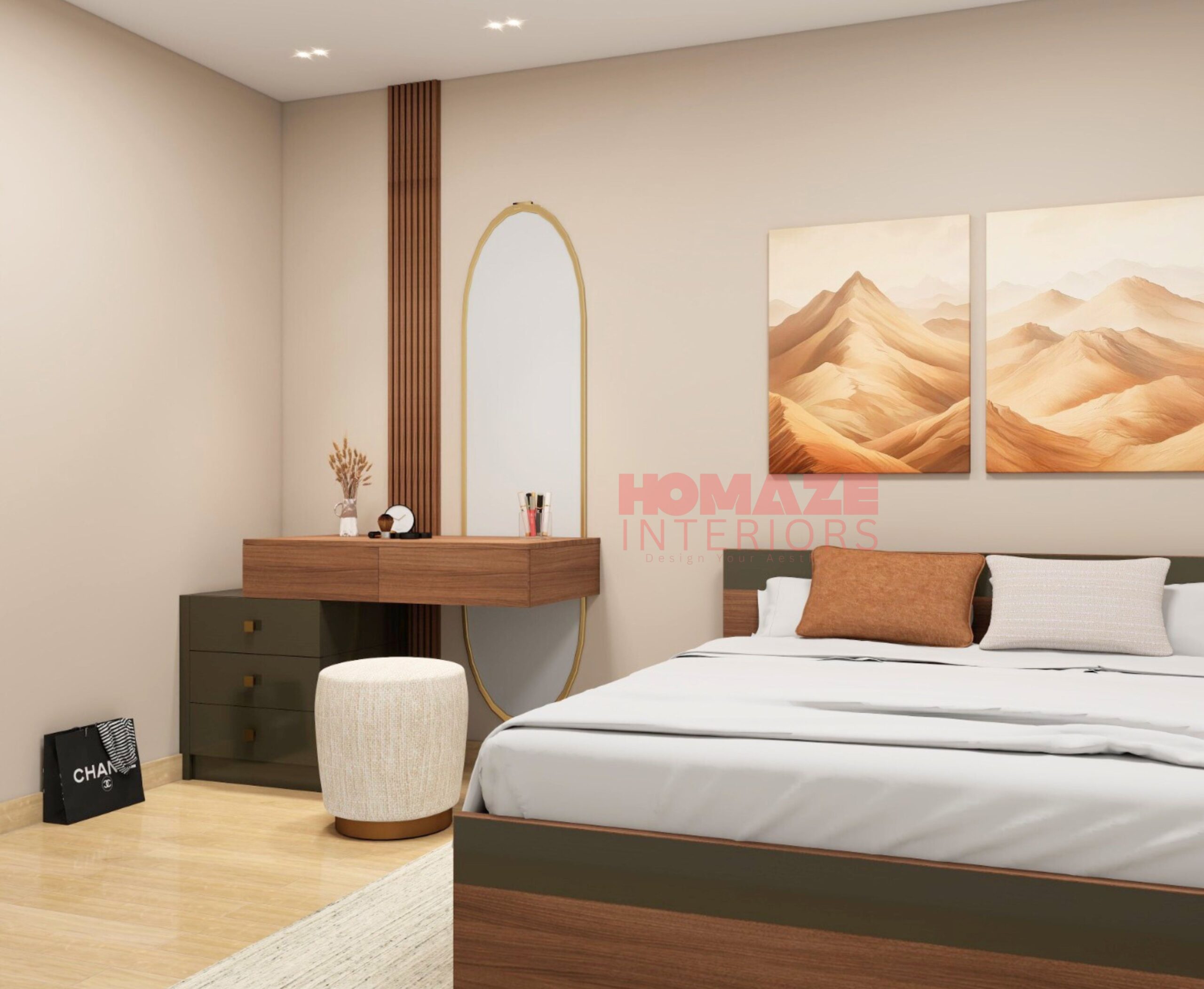 A well-organized wardrobe, storage space and dressing table for all her grooming and dressing needs.