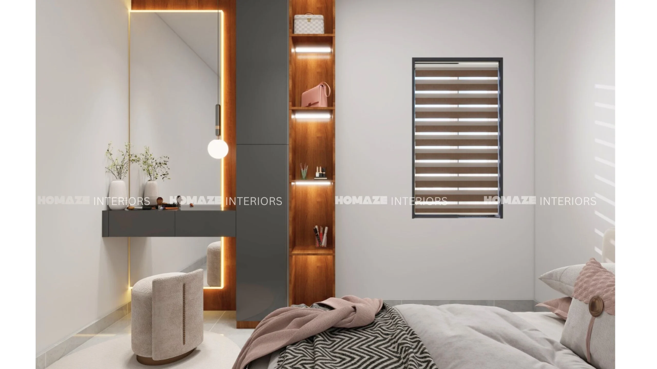 Designed for space maximising and comfort, nothing is on the floor, and heights reflect the items stored with shelving in the easy see and reach zone. Intelligent design by Homaze Interiors designers.