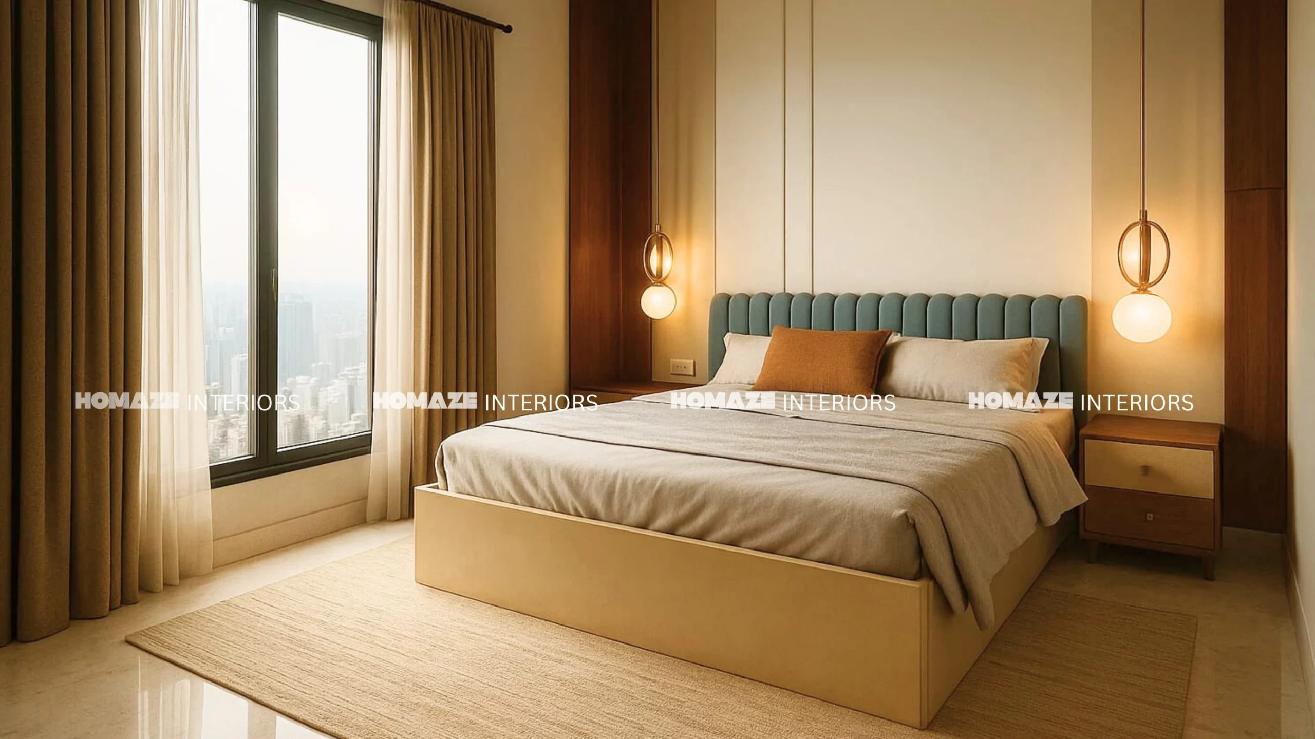 Guest bedroom queen size cot designed by arena interiors, this  elevated wood theme bedroom make the feel of clam and relaxing.