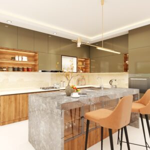 Modern kitchen fabricate using laminated marine plywood carcass and  shutters with single  color  of  Slate Glossy 22099 merino laminate for both overhead cabinets and bottom storage units. kitchen can be customized as per customer requirements and according to measurements of the kitchen.