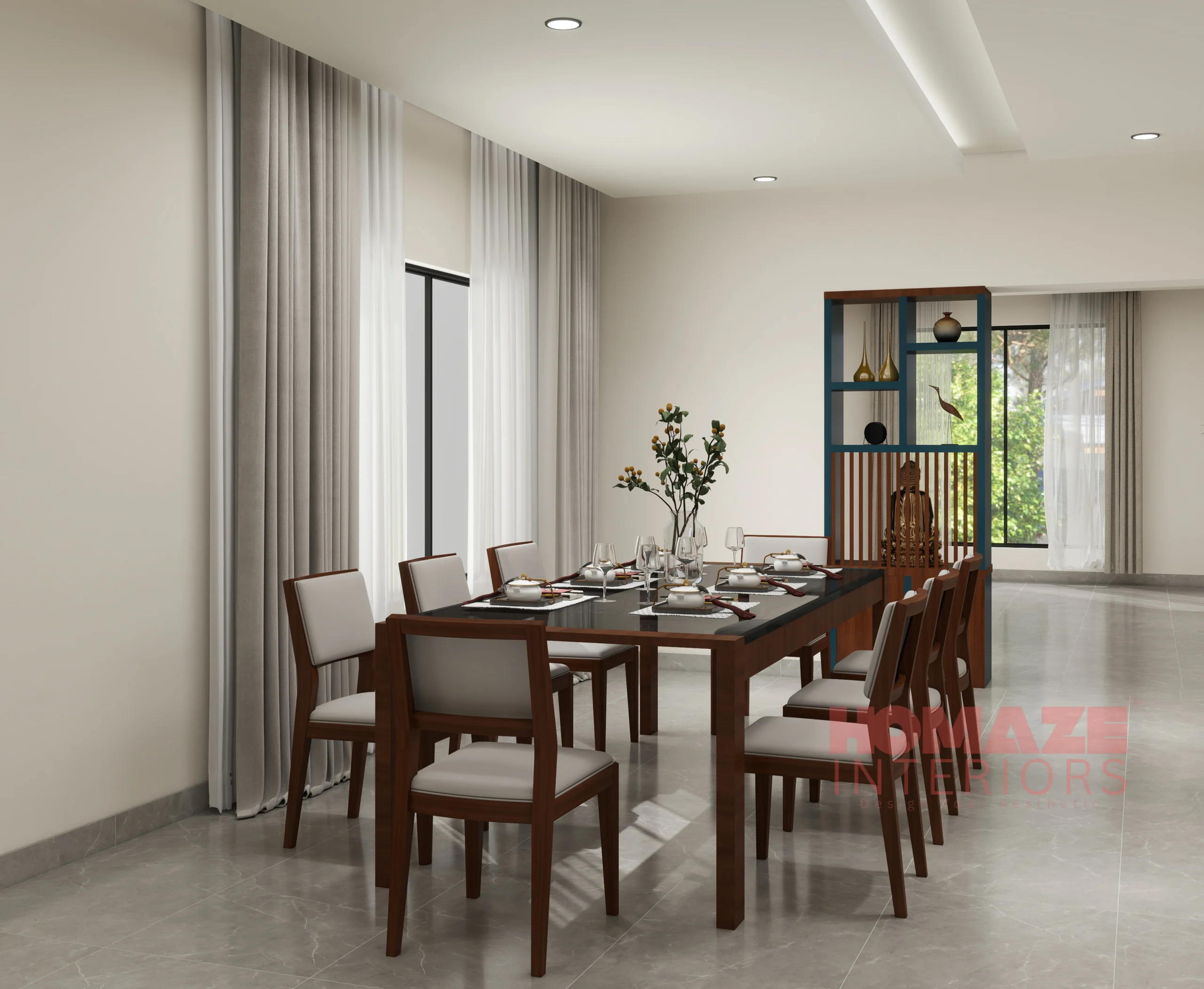 Featuring a sleek wooden dining table with a rich walnut finish and comfortable cushioned chairs, this design blends modern simplicity with timeless sophistication. The clean lines and neutral upholstery create a welcoming ambiance, while the strategically placed open partition unit adds functionality and a stylish visual divide between spaces. Soft, floor-length curtains and abundant natural light enhance the airy atmosphere, making it an ideal setting for family gatherings or formal dinners. Perfectly suited for modern Kerala homes in Trivandrum, Thrissur, or Cochin, this setup combines aesthetics with practicality for a truly inviting dining space.